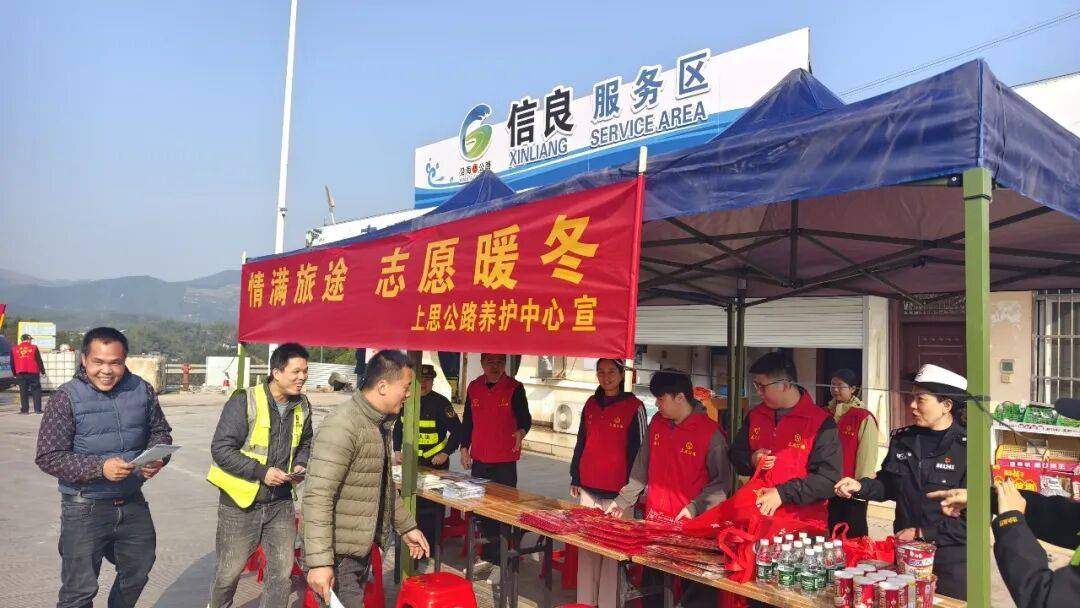 2月3日,上思公路养护中心联合上思县公安局交通管理大队、上思县交通运输局综合行政执法大队,在国道210线信良服务区开展“情满旅途 志愿暖冬”春运联合保障服务行动,共同为春运旅途筑牢安全防线,传递新春温暖。