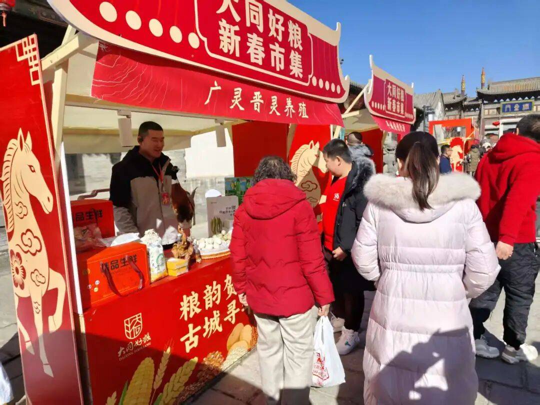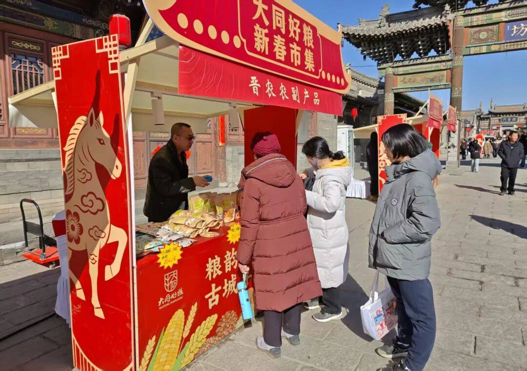 大年初三启幕的“大同好粮”新春市集成为古城云路街最火热的场景。这次以“粮韵贺岁,古城寻年”为主题,融合传统年俗与现代科技的市集,吸引众多市民游客驻足打卡。来自云冈区上窝寨村的“人机共舞庆丰年”社火表演、气势磅礴的舞龙舞狮表演成为全场焦点,田锦农业的黍米汤圆,雁门清高的苦荞茶,同兴源的速冻糯玉米等36家企业280多种特优农产品和非遗产品成为大同古城最聚人气的“年味担当”。